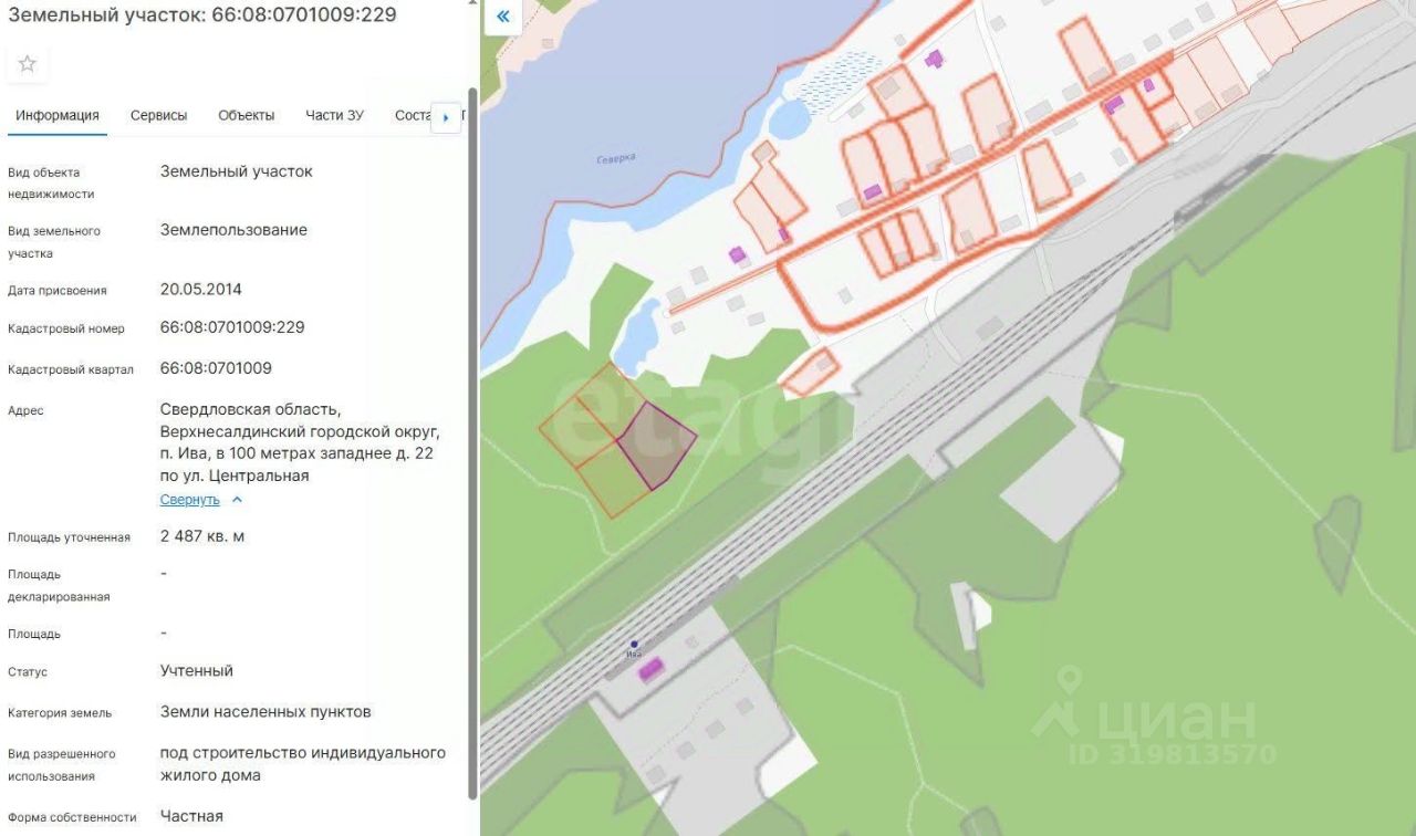 Земельный участок площадью 24,87 соток расположен в поселке Ива, в 100 метрах от дома 22 по улице Центральная. Участок предназначен для ИЖС и сочетает преимущества загородной жизни с удобной транспортной доступностью и развитой инфраструктурой. В пешей доступности (15-20 минут) находится поселок Свободный с полным набором социальных объектов: школа, детский сад, продуктовые магазины, отделение Сбербанка и почта. Подъезд к поселку осуществляется по асфальтированной дороге, внутри поселка — укатанная грунтовая дорога, поддерживаемая в хорошем состоянии.