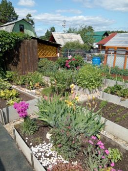 Плодоносящие кустарники (вишня, смородина, крыжовник, жимолость), сортовая клубника, многолетние цветы.