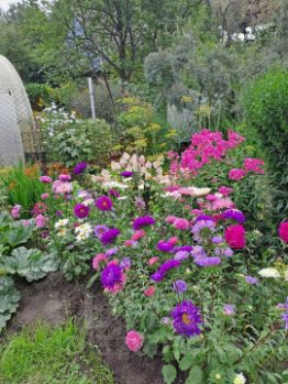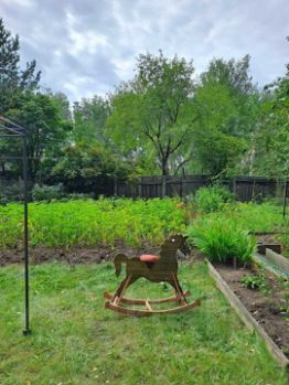 крыжовник зеленый и красный, смородина, малина, клубника, слива красная и желтая, чернослив молодой, облепиха, яблони летние и зимняя "Антоновка", ирга , вишня, лекарственные травы, 3 места под картофель ранний и на зиму.