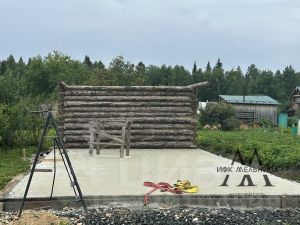 На участке залита плита под банный комплекс и стоит бревенчатый сруб для бани.
