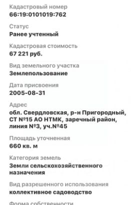 Продажа земельного участка СТ 15, АО НТМК, заречный район, линия 3, уч. 45. Садовое товарищество "ЛЕБА".