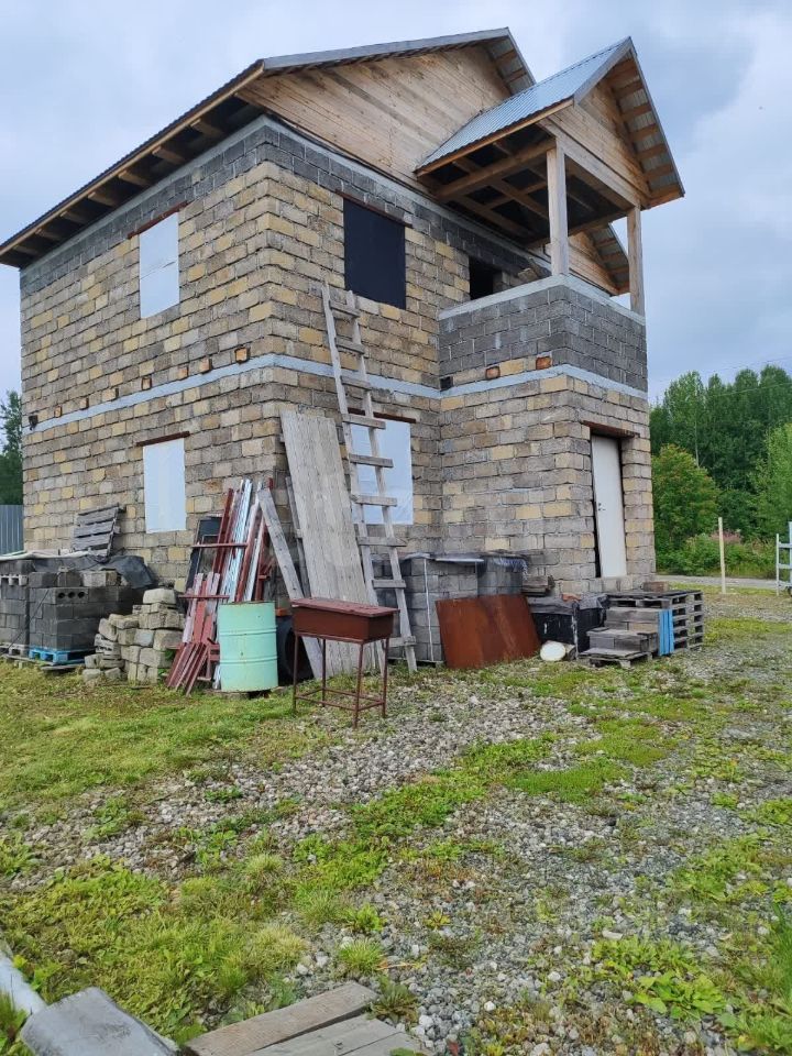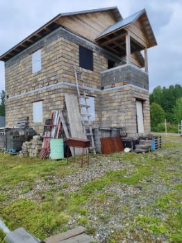 Дом трехэтажный, из газоблока, фундамент свайно-монолитный, 1 этаж кухня гостиная, 2 этаж 3 комнаты и 1 комната на 3 этаже. Дом не достроен, требует отделки. На участке есть теплица и грядки под овощи и зелень, большая поляна с беседкой и мангалом, навес для хранения дров и инструментов.