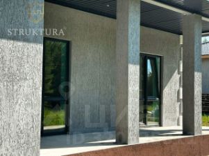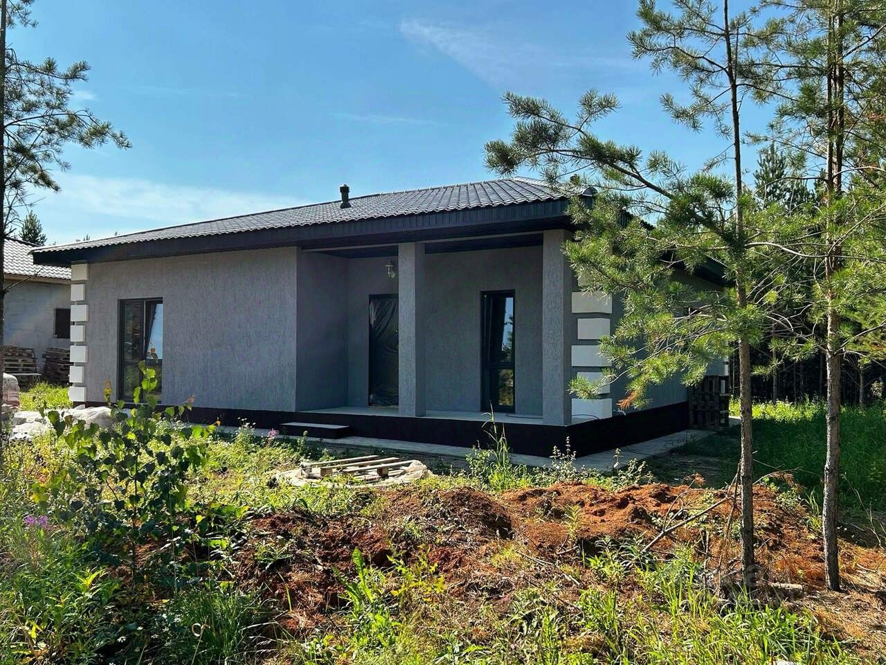 Фасад дома выполнен из декоративной штукатурки серого цвета с выразительными рустами на углах — это не только привлекательно и современно, но и даёт дополнительный слой утепления. Надежность конструкции подтверждают бетонная отмостка по всему периметру и прочное бетонное крыльцо, а качественная металлочерепица антрацитового цвета доводит образ дома до совершенства.