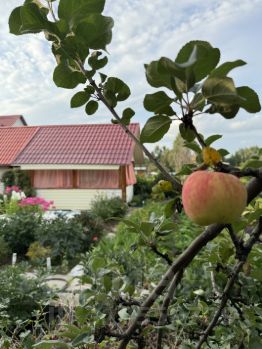 На участке растут яблони, смородина, малина, жимолость, клубника, горные сосны, голубые ели, кедр, гортензии, пионы, оформленные грядки.