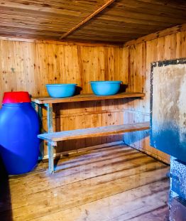 Баня имеет раздевалку с местом для отдыха, и парилку с мойкой.