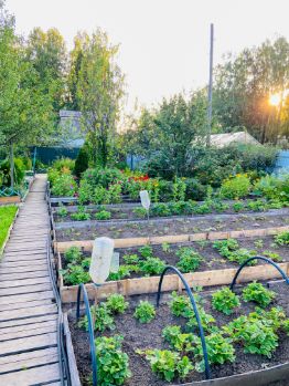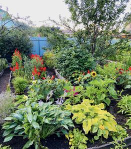 Это и плодоносящие яблони, груша, вишня, малина, туя, шикарные пионы, гортензия, флоксы, лилии, хосты, лаватера, и много других диковинных однолетних и многолетних растений. Клубника и земляника растут на полностью обработанных грядках, так же посажены молодые кусты голубики.