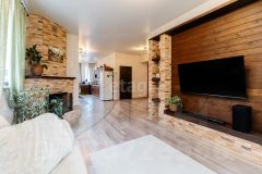 На первом этаже Кухня гостиная с камином, сан. узел, гардеробная и котельная.