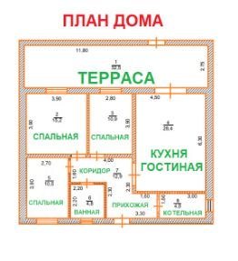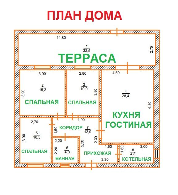 В доме 8 помещений: 4 жилых комнаты до 28 кв.м., гостиная с кухонной зоной, санузел, тамбур с прихожей и коридором. Санузел оборудован техникой, бойлер, раковина, унитаз, есть разводка под стиральную машину, ванную и душевую кабинку.