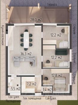 Кухня-гостиная 36 квм, три спальни 12,12,13 квм, два санузла