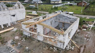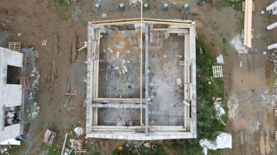 - Коробка под крышей, окна, двери, скважина (уже заведена в дом), теплые полы (сделана разводка)