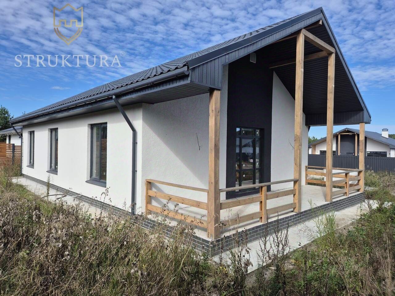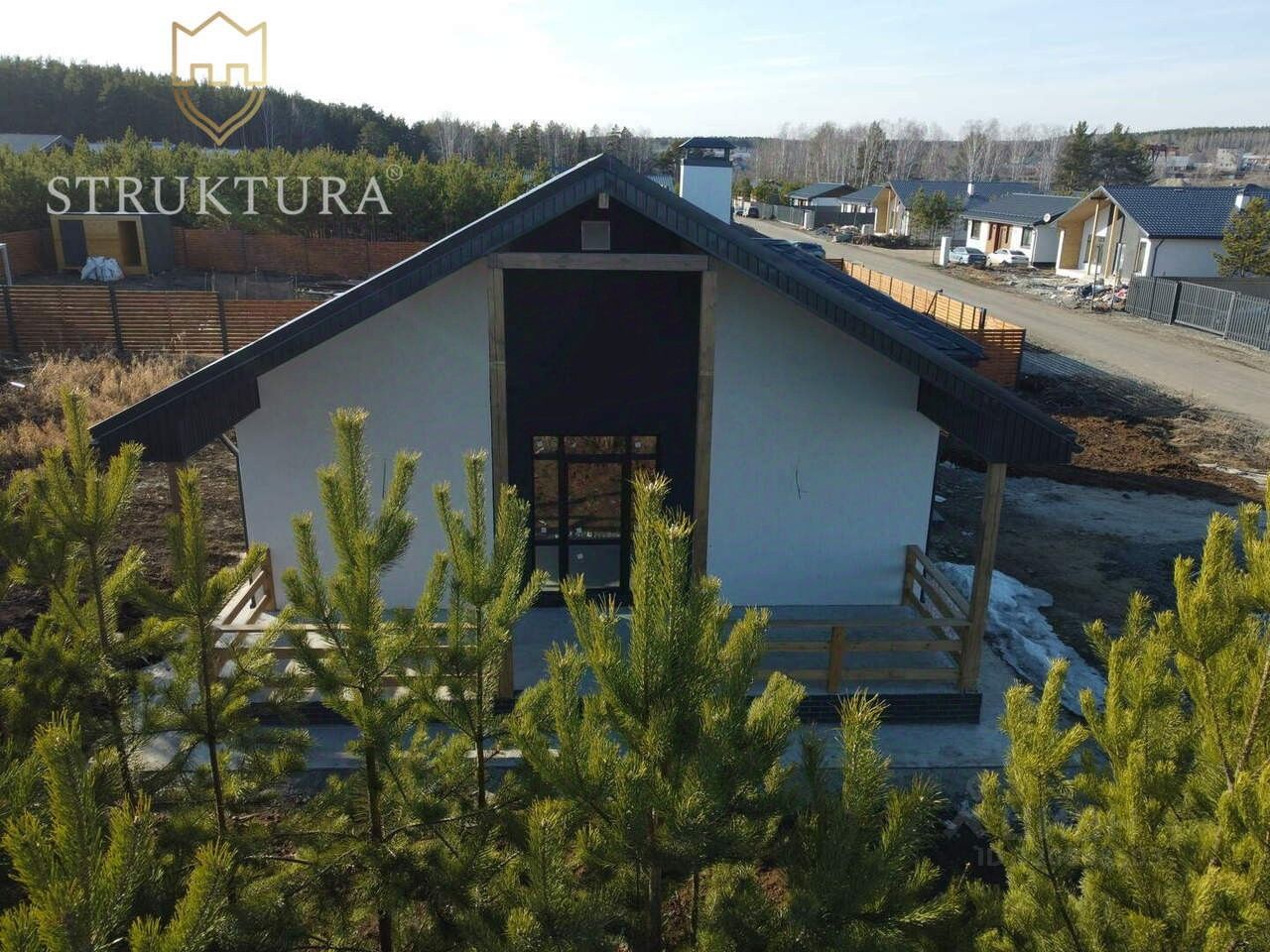 Фасад дома выполнен в сочетании штукатурки и натурального дерева. Входное крыльцо дома находится под крышей, что убережет вас от осадков в ненастную погоду. Надежная крыша двускатного типа покрыта металлочерепицей графитового цвета комплектом к окнам того же оттенка .