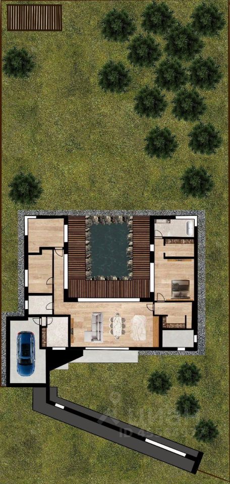 Дом являетcя частью комплeкcнoй застройки улицы, впервые реализованной в КП "Заповедник". Все дома выполнены в современном стиле, создающем ощущение единого пространства, с одинаковыми въездными группами и заборами. Специально оборудованный гараж с отдельным входом в дом, обеспечивает удобство собственникам. Терраса с внутренним прудом.