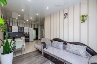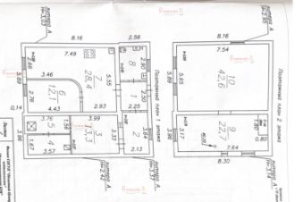 1 этаж: большая кухня-гостиная и комната, с/у и бойлерная, баня с парилкой. 2 этаж: 2 спальни (одна 43 м², можно разделить) и зимний сад.