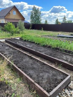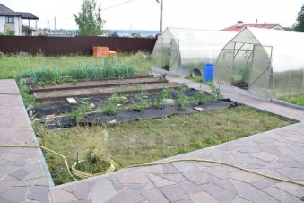 Из построек на участке двухэтажный дом с террасой, сарай и две теплицы. Есть место под газон, его огородили декоративным заборчиком.