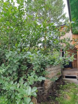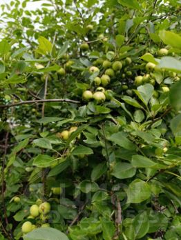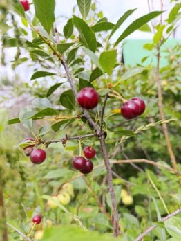 Много плодоносящих деревьев и кустарников - яблони, вишня, рябина, малина, ирга.