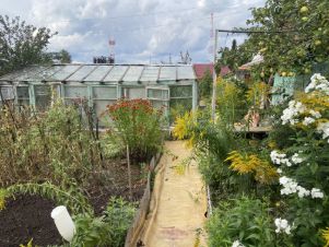 С одной стороны участок расположен рядом с забором, где расположены дополнительные посадки, компостная яма, туалет, хоз. блок и инвентарем и инструментами.