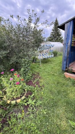На участке баня, много многолетних насаждений.