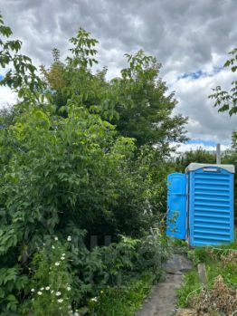 На участке стоит уличный туалет и летний вагончик, возле вагончика - большой вольер для собаки с будкой.