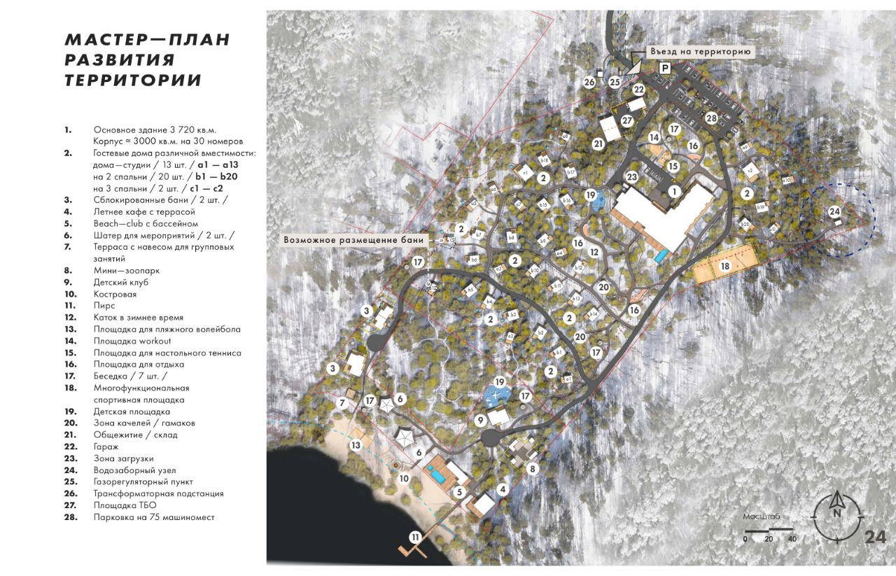 Разработан мастер план участка для строительства гостиничного комплекса, передается Вам при покупке.