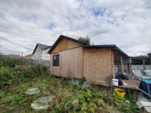 На участке расположены дом 76 квадратных метров, построенный по каркасной технологии, баня 4х2 метра, беседка 4х2 метра.