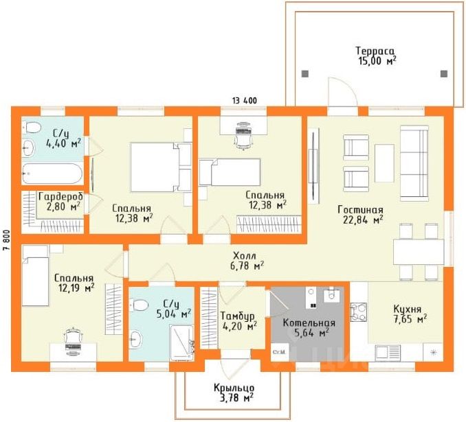 Внутри вас ждут 4 комнаты, включая 3 просторные спальни. Также в доме есть котельная, ванная комната, гардеробная (все эти помещения оборудованы необходимыми коммуникациями для оборудования санузлов .