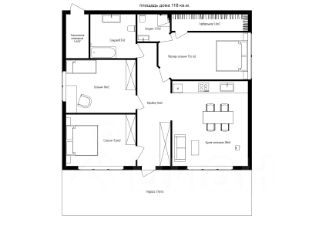 • Гостиная + кухня-столовая — 28 м², высота потолков 2.9 м, панорамные окна с портальной системой открывания, раздвижная стеклянная стена выходит прямо на террасу и газон