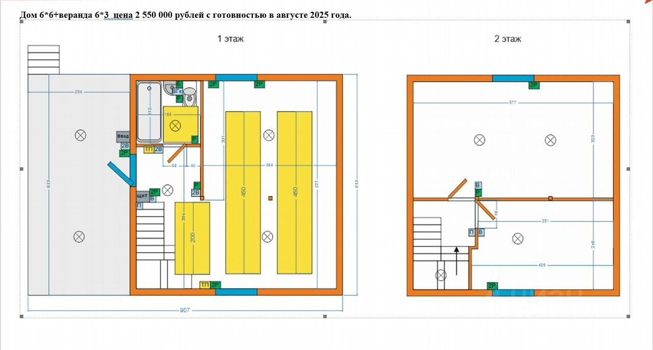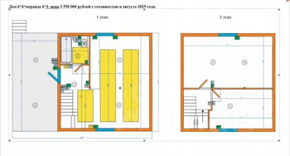 Дом размером 6 х 6 м в 2 жилых этажа, второй этаж мансардный.
