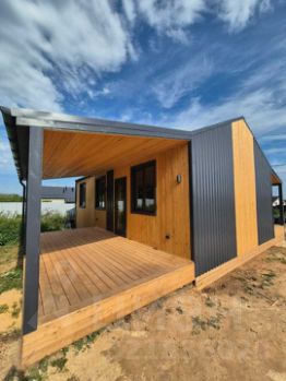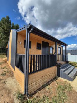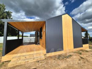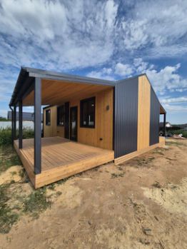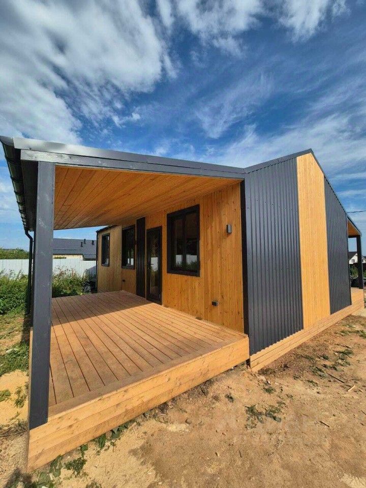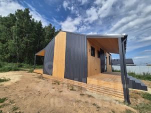 * Отделка: Внутренние стены обшиты имитацией бруса, создающей уютную атмосферу. Крыша из металлочерепицы цвета "графит".