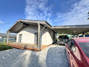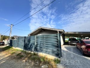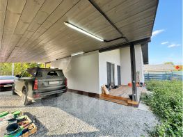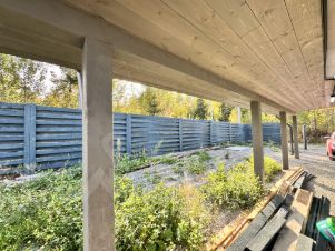 Участок выровнен, огорожен забором с откатными воротами, есть навес на две машины.