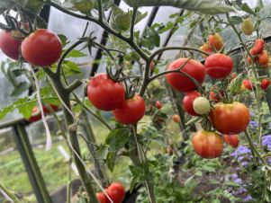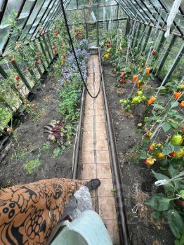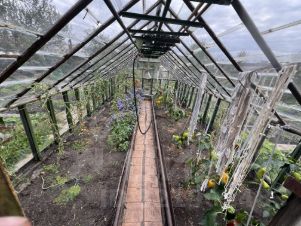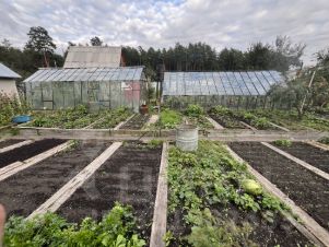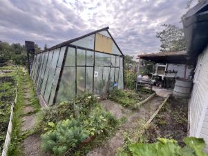 - 2 фундаментальные теплицы из металла (около 100 окон каждая), с каменными дорожками, высокими грядками и системой автополива (бочка с подачей тёплой воды + шланги); урожая хватает на 23 семьи!