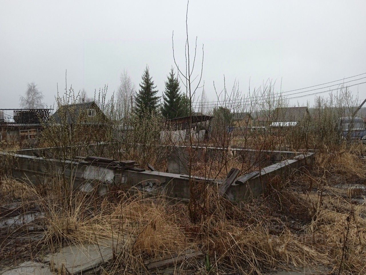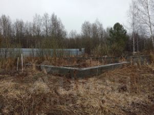 На участке на котором расположен фундамент под двухэтажный дом есть лиственница, ель и плодоносящие насаждения (яблони, смородина, крыжовник, малина, вишня и т.д). сарай для хранения инвентаря.