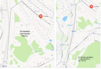 До ж\д остановки 740 метров, 10-15 мин. пешком, остановка "Исеть" (см. фото).