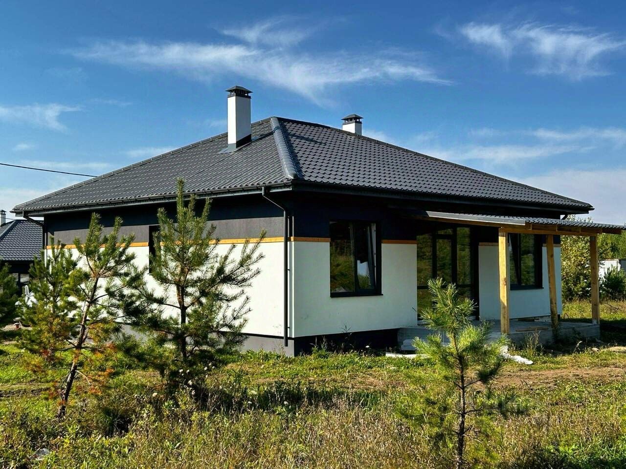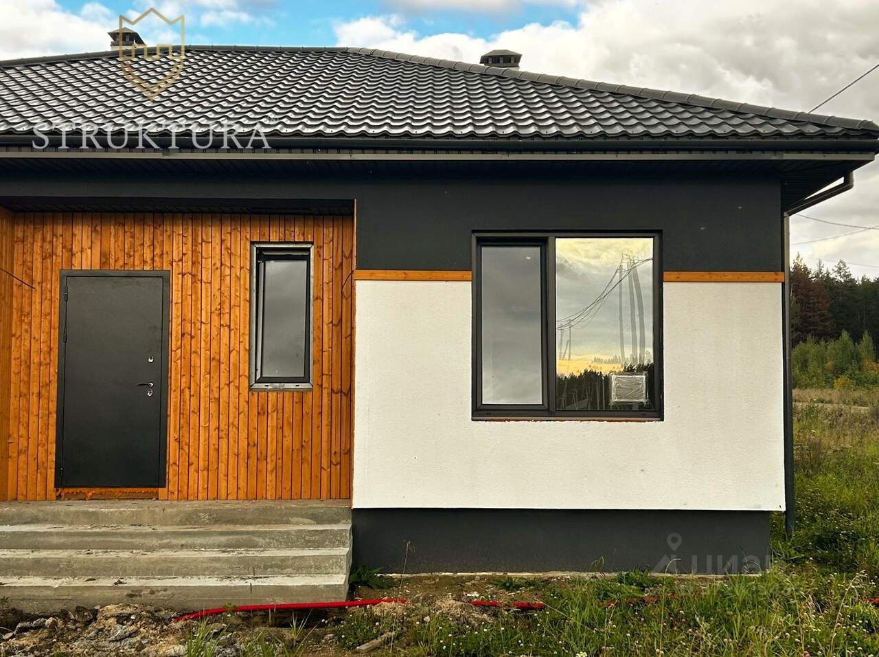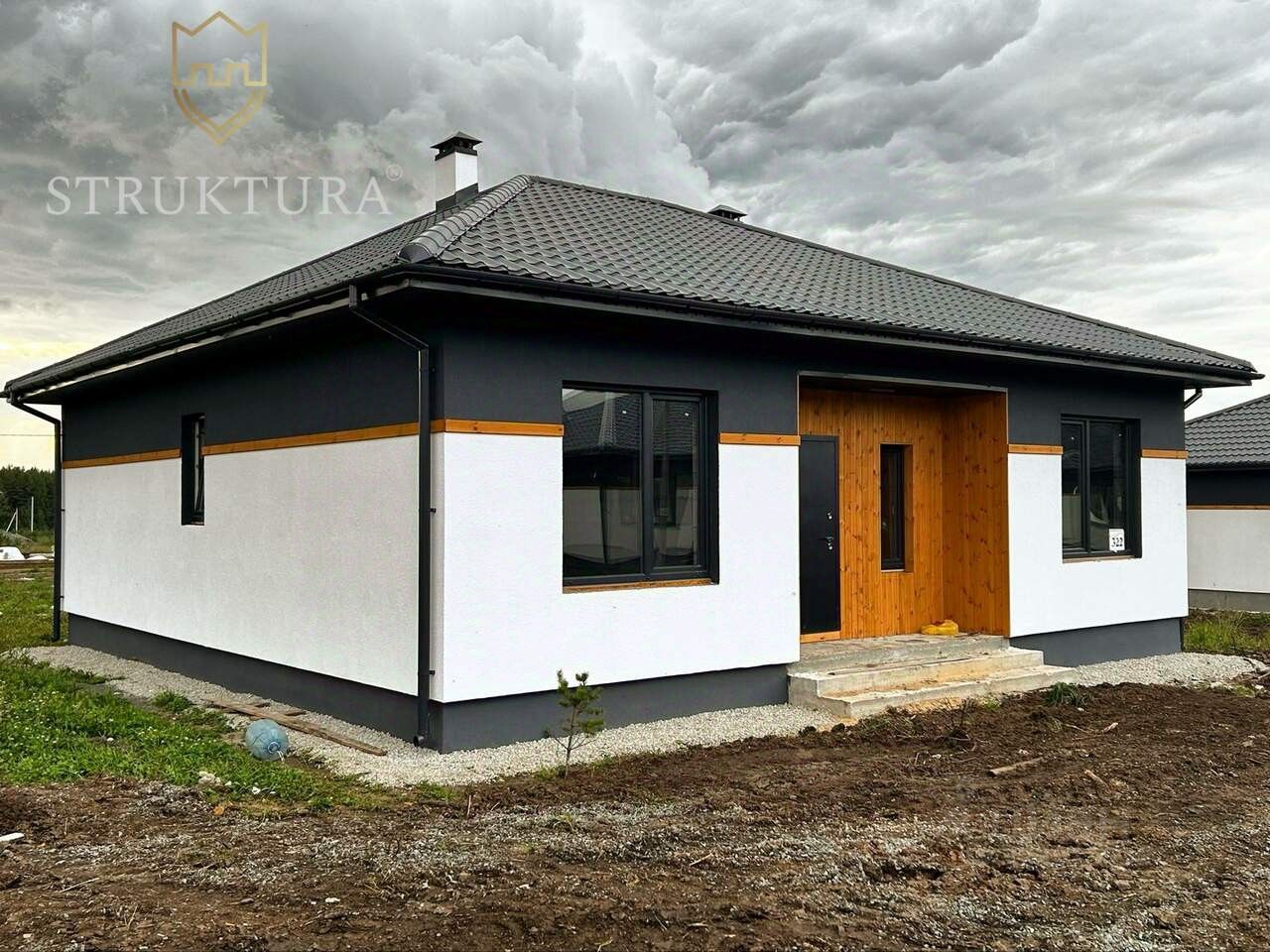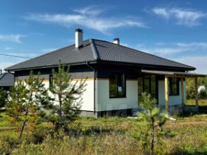 Фасад дома оформлен в элегантной чёрно-белой гамме с использованием декоративной штукатурки. Контрастное сочетание чёрного и белого цветов изящно гармонирует с элегантными деревянными элементами, которые украшают весь периметр здания. Надёжная металлочерепица обеспечивает защиту от любых погодных условий. Особую выразительность облику дома придают стильные чёрные окна, а практичную функциональность дополняет просторная бетонная терраса под отдельной крышей.