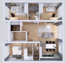 Продуманная планировка включает просторный холл, три изолированные спальни, одна из них мастер-спальня, где каждый член семьи найдёт свой уютный уголок для отдыха. Центральное место в доме занимает просторная кухня-гостиная, объединённая с террасой. Три санузла, один из которых совмещён с котельной, обеспечивают максимальный комфорт для всей семьи. Каждая деталь интерьера продумана до мелочей: от эргономичного расположения комнат до удобных систем хранения. Особого внимания заслуживает терраса с потрясающим видом на окружающий пейзаж. Здесь вы сможете наслаждаться утренними часами под пение птиц и проводить умиротворяющие вечера, любуясь природой.