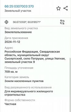 Адрес: Российская Федерация, Свердловская область, муниципальный округ Сысертский, село Патруши, улица Уютная, земельный участок 9.