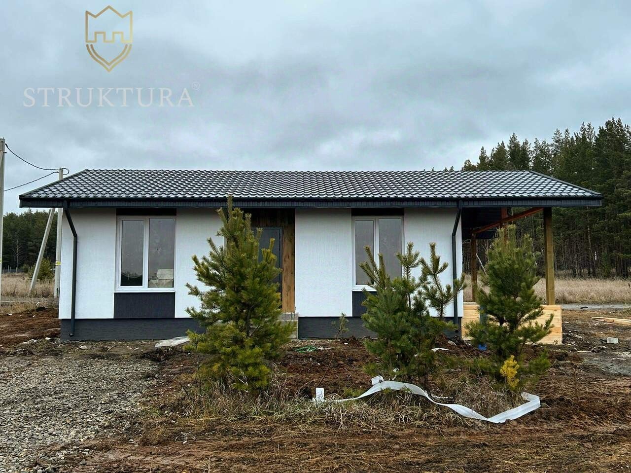 Фасад дома выполнен в сдержанном чёрно-белом стиле с декоративной штукатуркой. Контрастное сочетание цветов дополнено элегантными деревянными элементами по периметру здания. Крыша покрыта надёжной металлочерепицей, которая защитит от любых погодных условий.