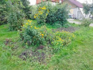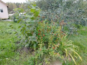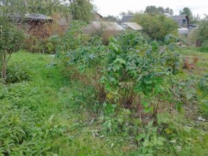 Растения: яблони, груша, малина, клубника, грядки из под картошки, морковки.