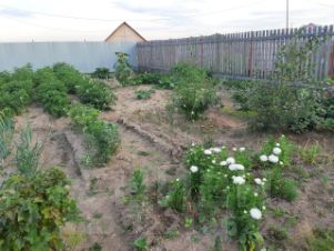 На участке растут плодовые деревья и кустарники: смородина, облепиха, вишня, жимолость, яблоня.