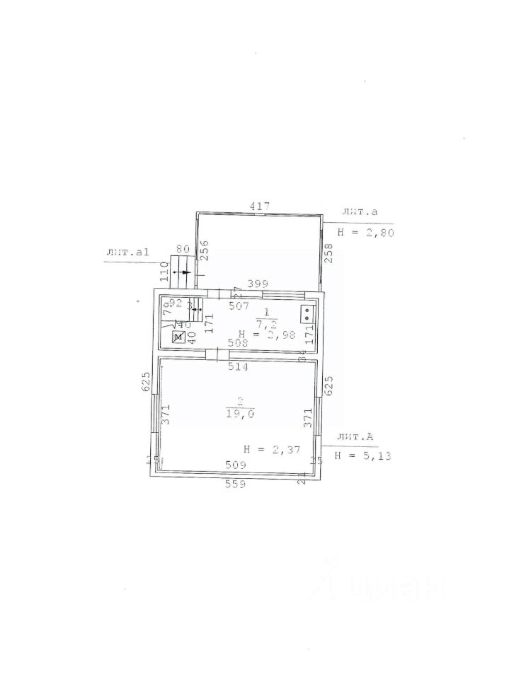 - двух изолированных комнат (одна на первом 19м2, другая на втором этаже 19м2)