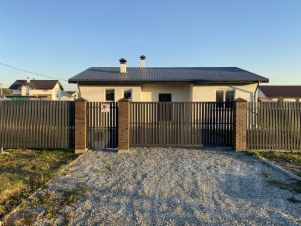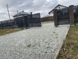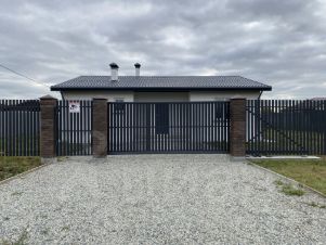 Для безопасности сразу установлен забор - кирпичные столбики и евроштакетник, откатные ворота системы Алютех и калитка.