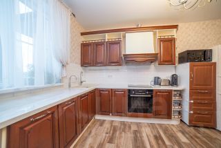 Дом двухэтажный. На первом этаже: прихожая, котельная, кладовая, кабинет и огромная кухня-гостиная, в которой останется кухонный гарнитур "Мария" из итальянского массива натурального дерева со встроенной техникой Воsсh.