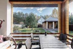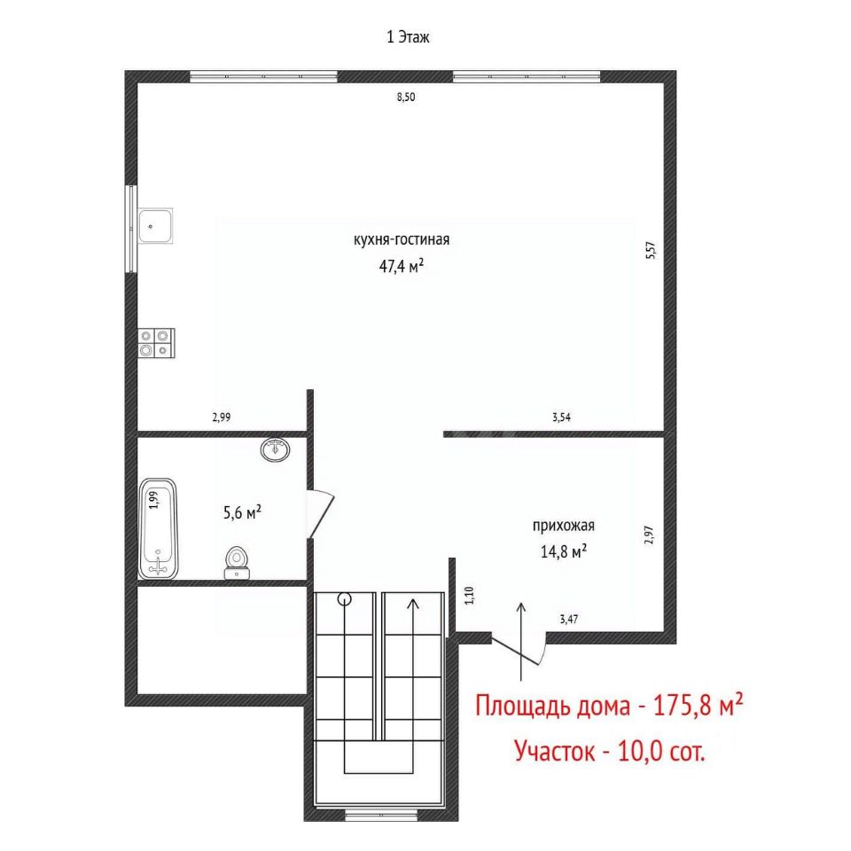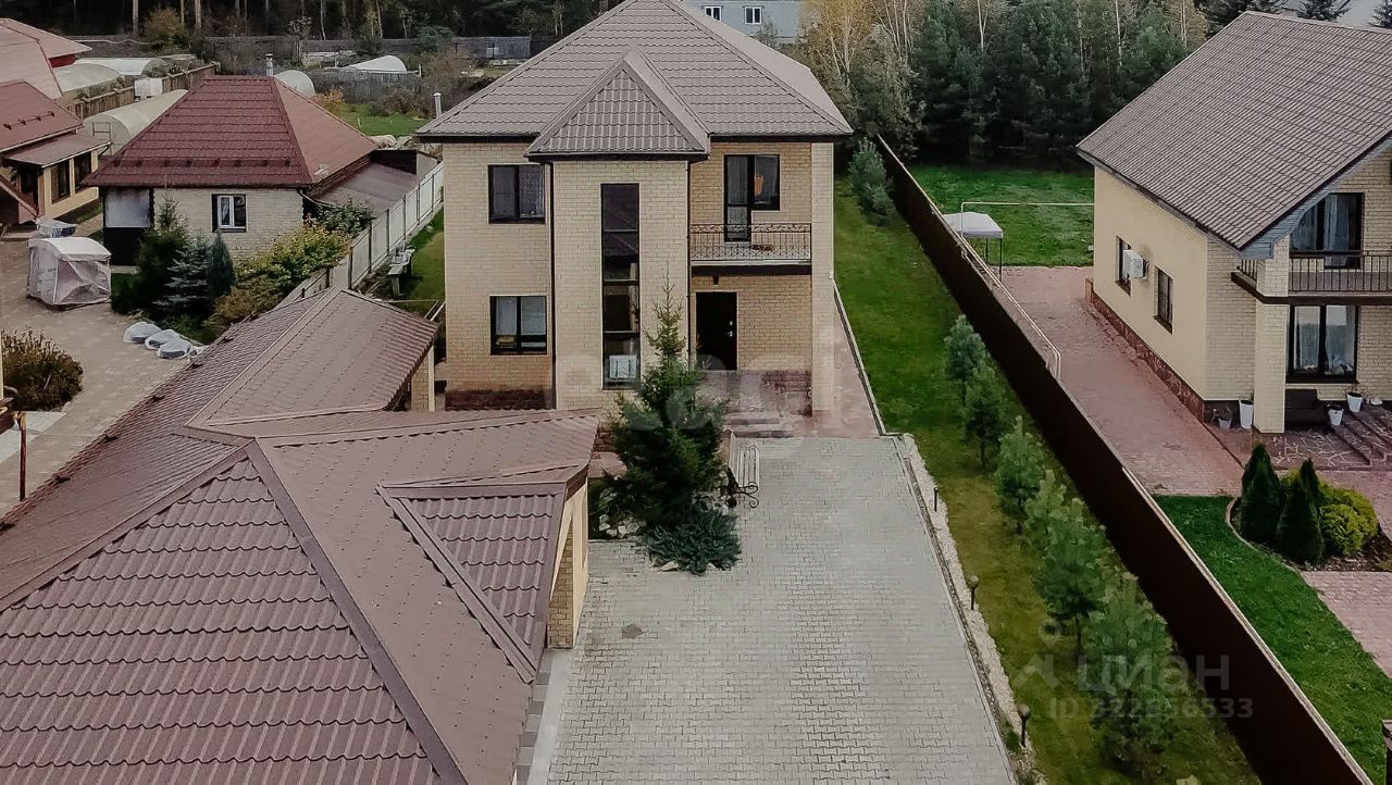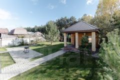 На территории участка в 10 соток располагаются дом на 175.8 м2 с открытой террасой, гараж на 54 м2, баня 30 м2, хозяйственная постройка и просторная площадка перед домом вместимостью 6 автомобилей.