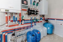 В бойлерной: газовый котёл, электрический резервный котёл, гидроаккумулятор на 100 литров и бойлер косвенного нагрева.