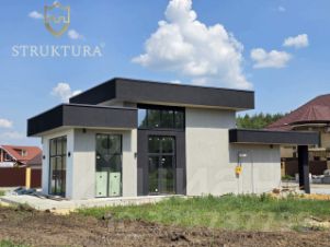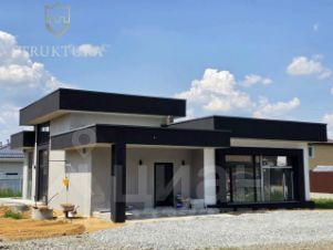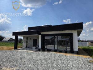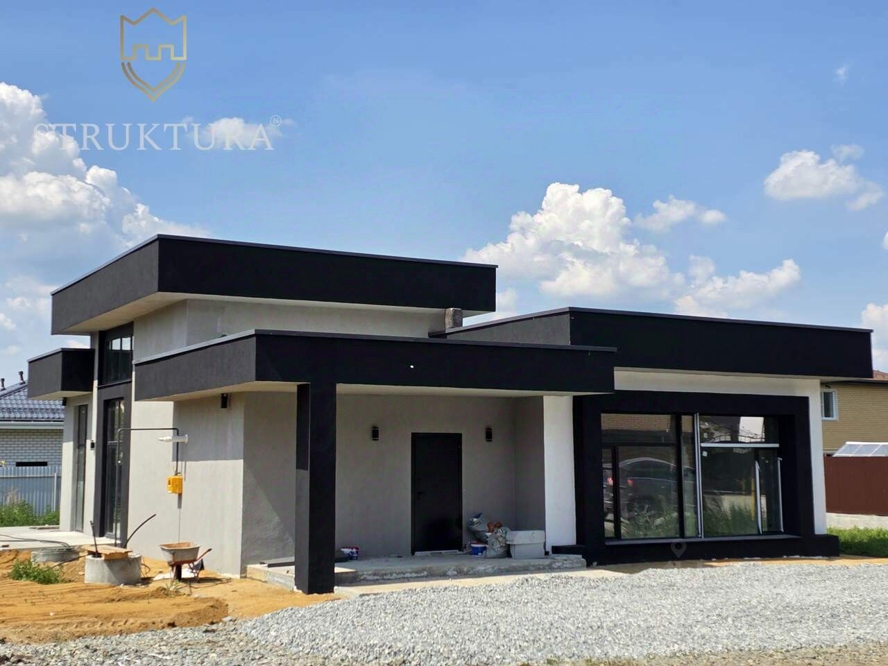 На большом и просторном участке, в самом центре поселка, стоит стильный одноэтажный дом с монолитной многоуровневой плоской крышей и большими панорамными окнами.