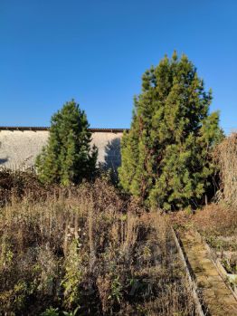 Истинным украшением участка являются величественные кедры и красавица-ель, которая с нетерпением ждет новогодних праздников, чтобы примерить свой праздничный наряд.