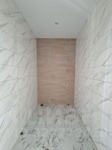 - Отделка: пол — керамогранит, стены санузлов — плитка, остальные помещения — обои под покраску; установлены розетки и выключатели, межкомнатные двери, натяжные матовые потолки с точечным освещением и выводами под люстры