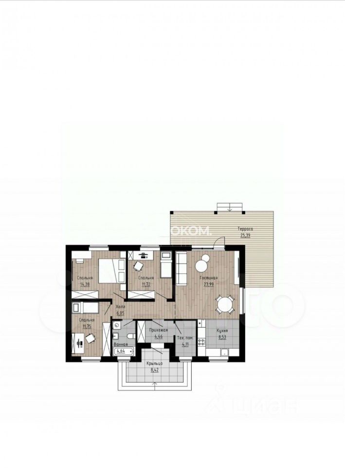 Продуманная планировка включает всё необходимое для комфортной жизни: просторная прихожая встречает вас теплом и уютом после насыщенного дня. Здесь найдется место для всей семьи: дети смогут оставить свои рюкзаки и игрушки, а взрослые — удобно разместить верхнюю одежду и обувь. Два современных санузла обеспечивают максимальный комфорт в утренние часы, когда вся семья готовится к новому дню. Три уютные спальни — это личное пространство для каждого члена семьи. Здесь можно отдохнуть от суеты, погрузиться в спокойный сон и восстановить силы для новых свершений. Светлая кухня-гостиная станет сердцем дома, где собираются все члены семьи. Большие окна наполняют пространство естественным светом, создавая атмосферу легкости и свободы. Выход на террасу открывает новые возможности для отдыха: утренний кофе с видом на сад, вечерние посиделки с друзьями или семейные праздники на свежем воздухе.