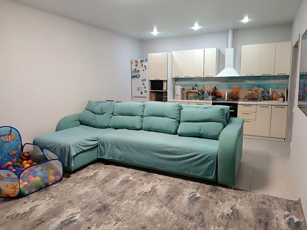 - Отделка: пол — керамогранит, стены санузла — плитка, остальные помещения — обои; установлены розетки и выключатели, межкомнатные двери, натяжные матовые потолки с точечным освещением и выводами под люстры