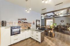 В основной части расположены все необходимые помещения: Прихожая, гардеробная, кабинет, мастер-спальня (со своим гардеробом и сан-узлом), гостиная, столовая и кухня - они объединены в одно большое пространство и вы сможете общаться с домочадцами и гостями.