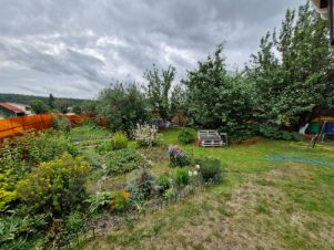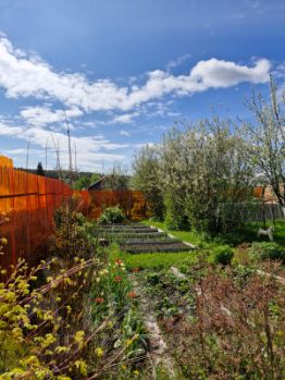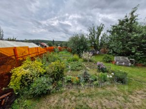 Насаждения: 3 большие яблони, много вишни, крыжовника, смородины, малины.